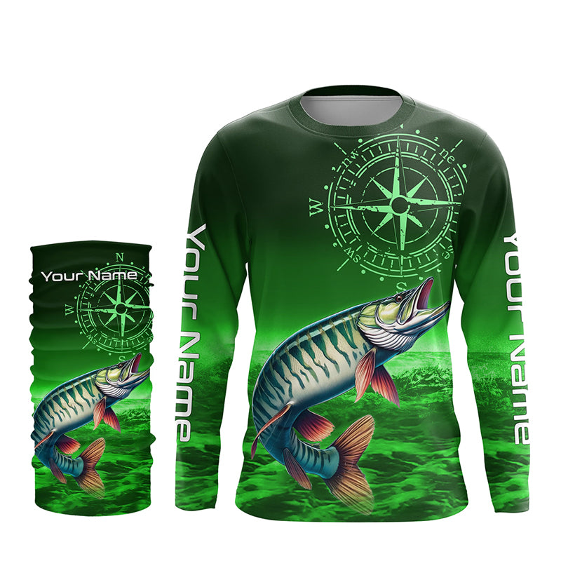 Personalized Musky Green Long Sleeve Performance Fishing Shirts, Muskie compass tournament Shirts NQS6333