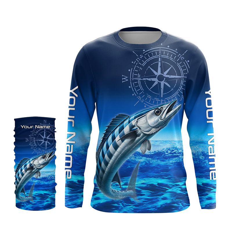 Personalized Wahoo Blue Long Sleeve Performance Fishing Shirts, compass tournament UV protection Shirt NQS5850