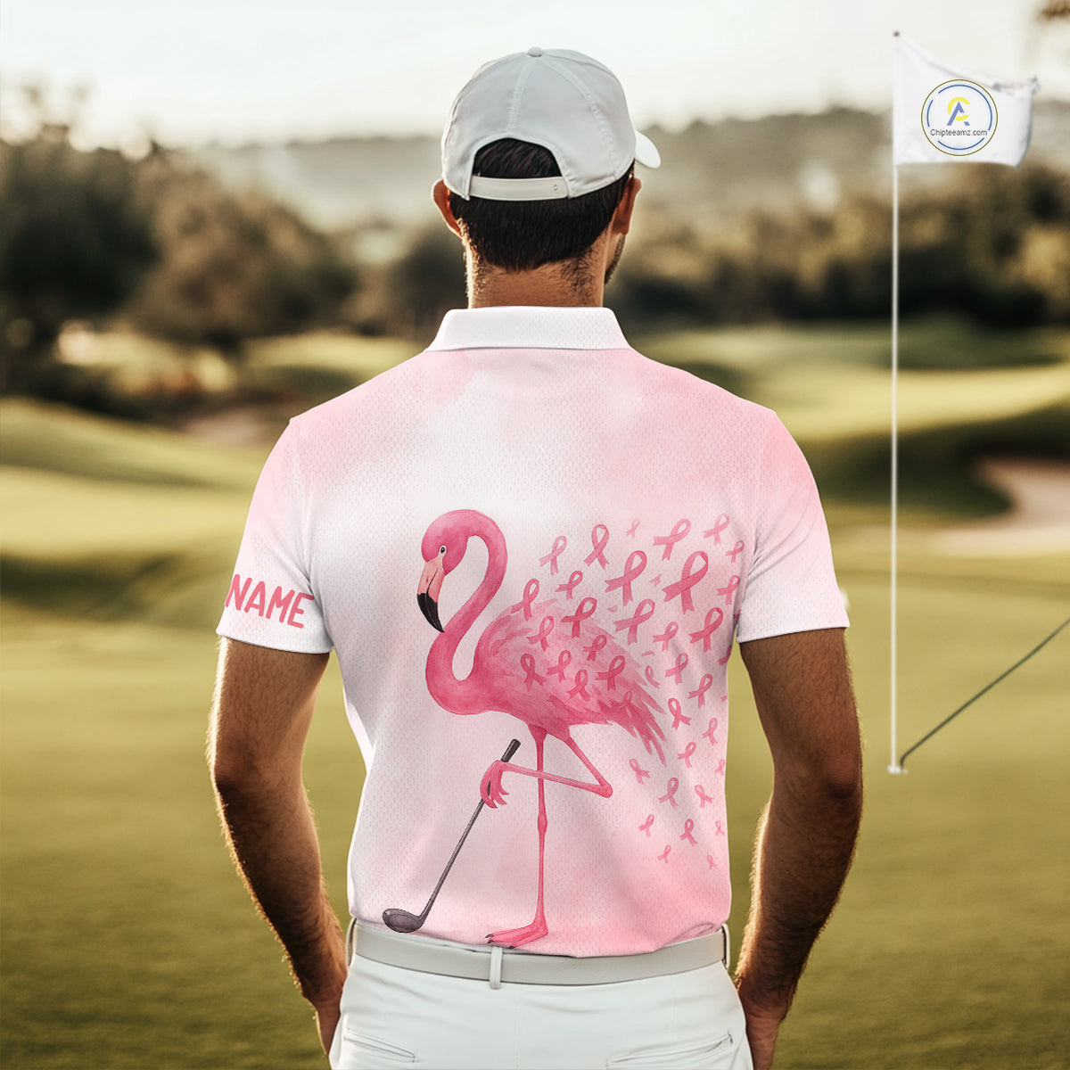 Watercolor Pink Flamingo ribbons Mens golf polo shirts Custom Breast Cancer Awareness men golf attire NQS10512