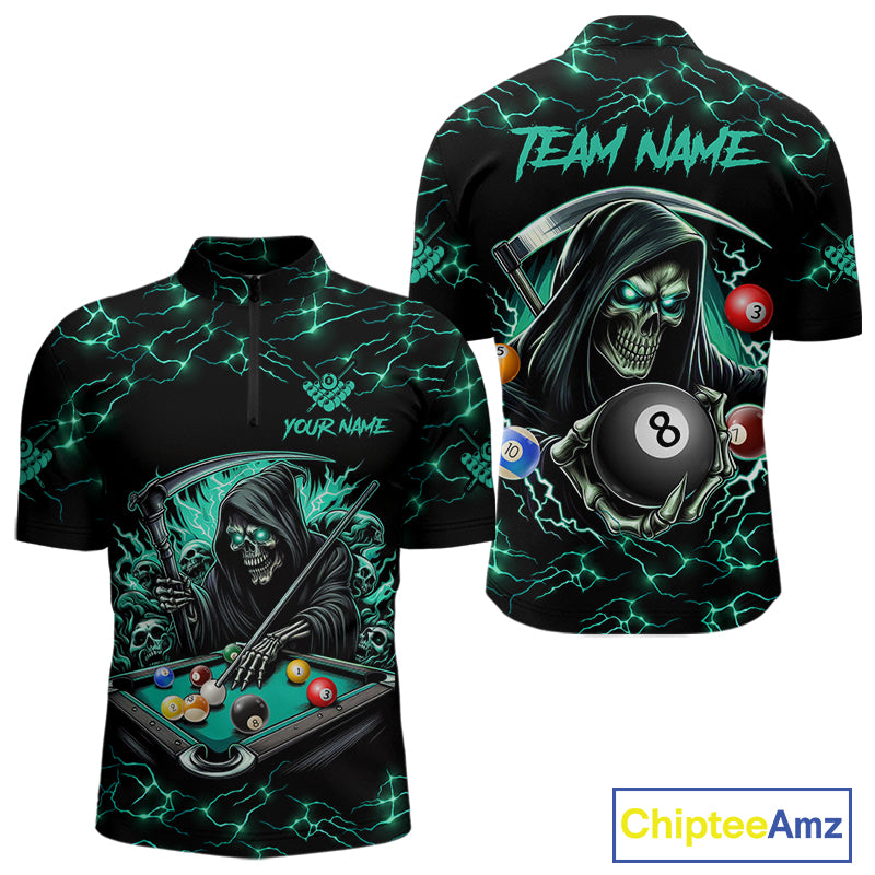 Turquoise Funny Grim Reaper 8 Ball Pool Men Billiard Shirt Custom Lightning Billiard Team Jerseys TDM5239