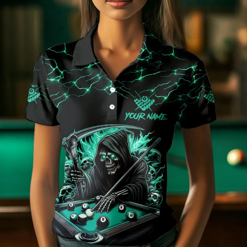 Turquoise Funny Death Skeleton 8 Ball Pool Women Billiard Shirts Custom Lightning Billiard Jerseys TDM2040