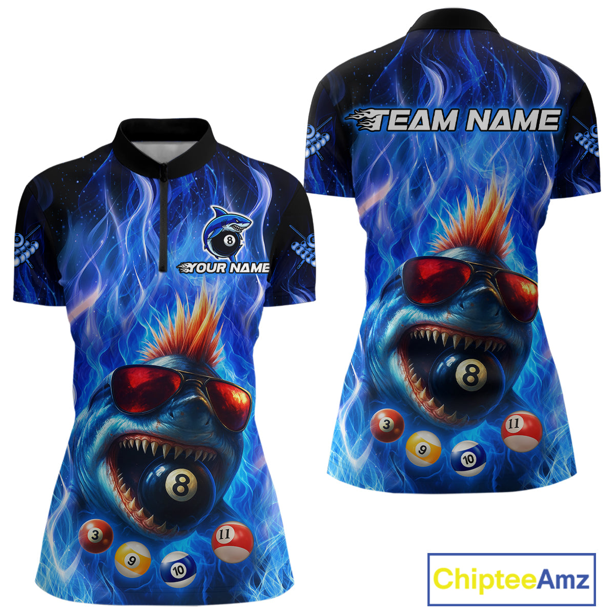 Personalized Blue Funny Shark Flame Women's Billiards Shirts Custom 8 Ball Billiard Team Jersey TDM5214