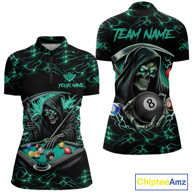 Turquoise Funny Grim Reaper 8 Ball Pool Women Billiard Shirt Custom Lightning Billiard Team Jerseys TDM5239
