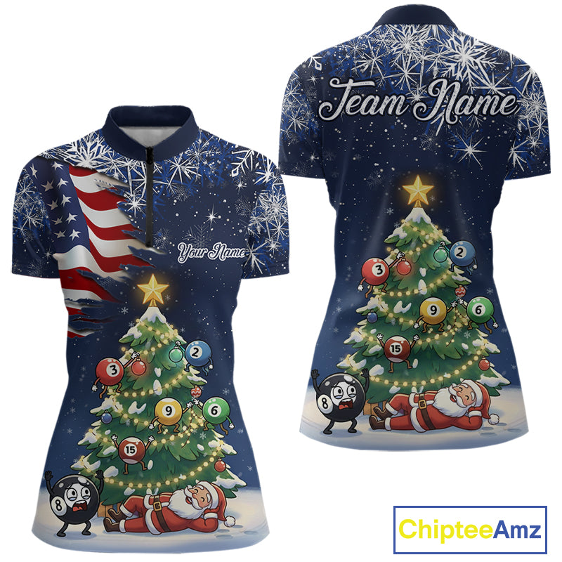 Funny Santa Christmas Billiard Shirts For Women Custom US Flag Xmas Pine Tree Pool Team Shirt TDM5289