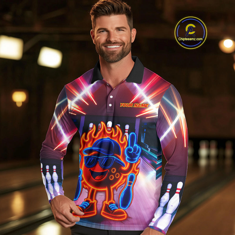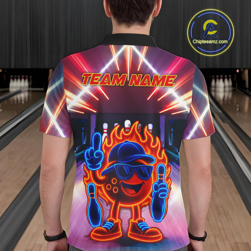 Funny Flame Neon Bowling Ball Mens Bowling Polo, Quarter Zip Shirts Custom Bowling Team jersey NQS10306