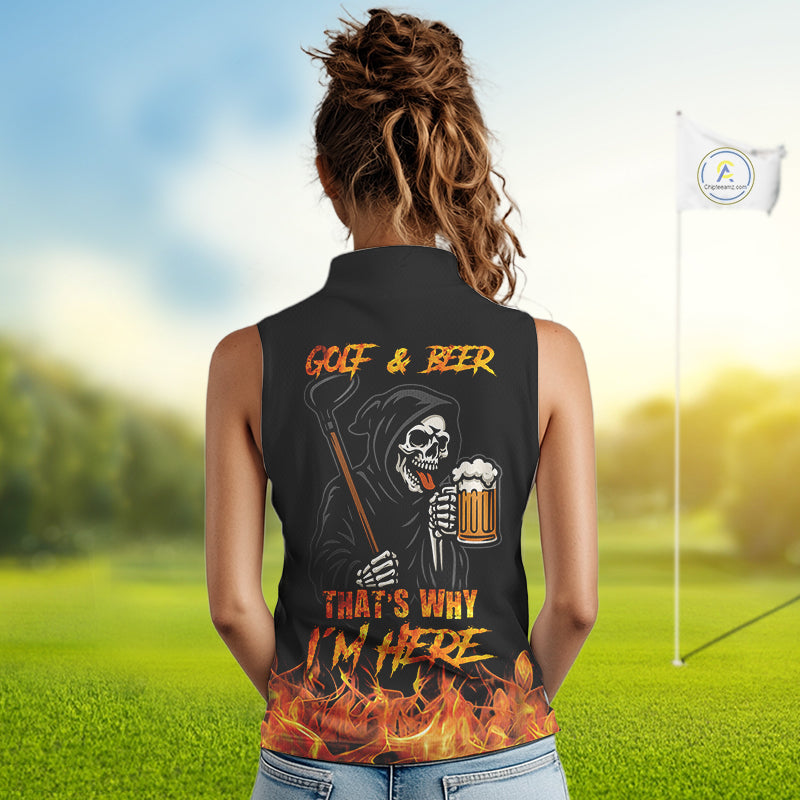 Funny Skull Reaper Lightning Flame Women Sleeveless Polo Shirt custom Golf & Beer That's why I'm here NQS10932