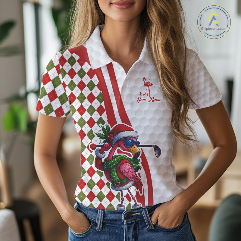 Funny Christmas Flamingo Women golf polo shirt custom red, green and white argyle pattern golf shirts NQS11086