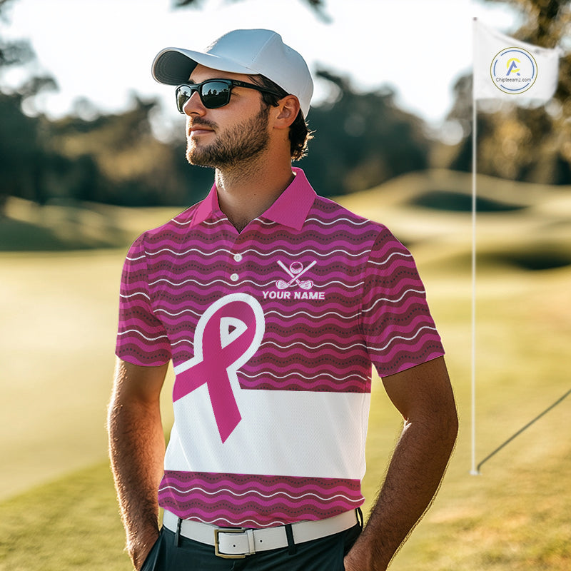 Pink ribbon Mens polo golf shirts Custom Breast cancer awareness team golf attire for men NQS10509