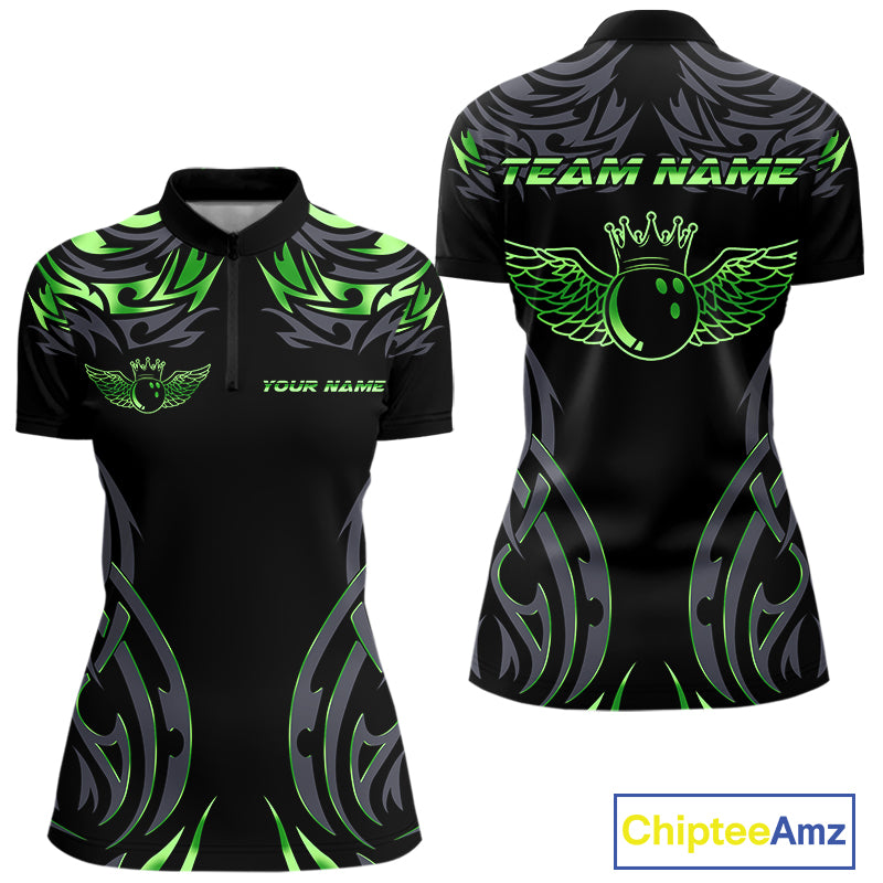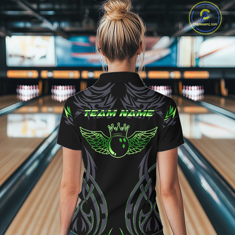 Personalized Black And Green tribal pattern Bowling Shirts For Women, angel wings Bowling Team jersey NQS10759