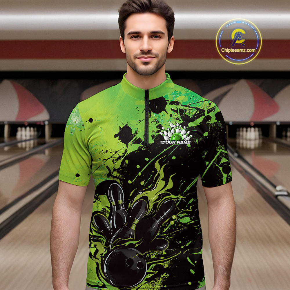 Custom Green Flame Bowling Men Quarter-Zip Shirts, Splatter Bowling Team Tournament Shirt IPHW9934