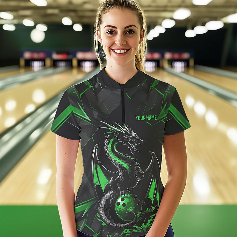 Custom Black And Irish Green Dragon Bowling Womens Quarter-Zip Shirts, Bowling Uniform IPHW8641