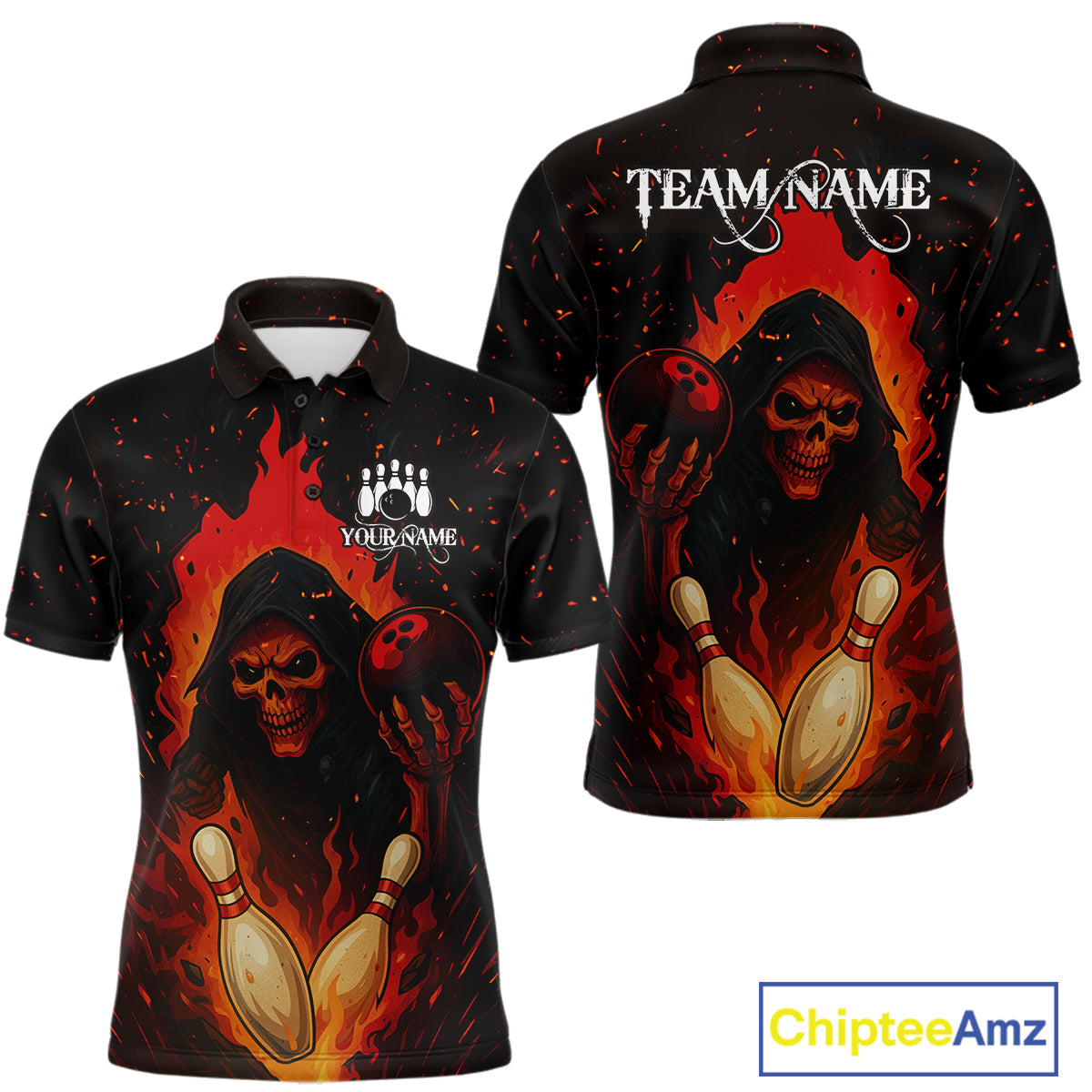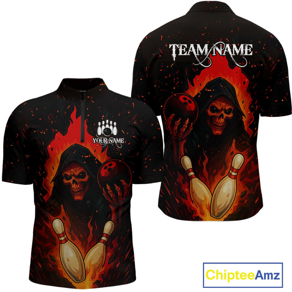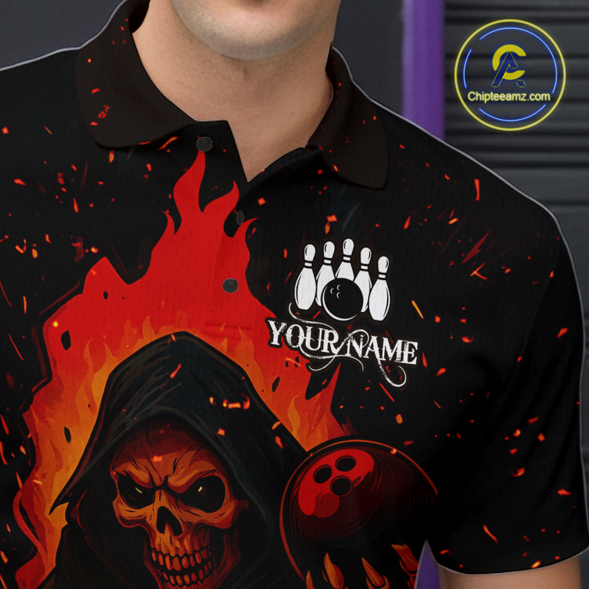 Black and Red Flame Skull Reaper Bowling Shirt For Men Custom Halloween Bowling Team Outfit Jerseys NQS10695