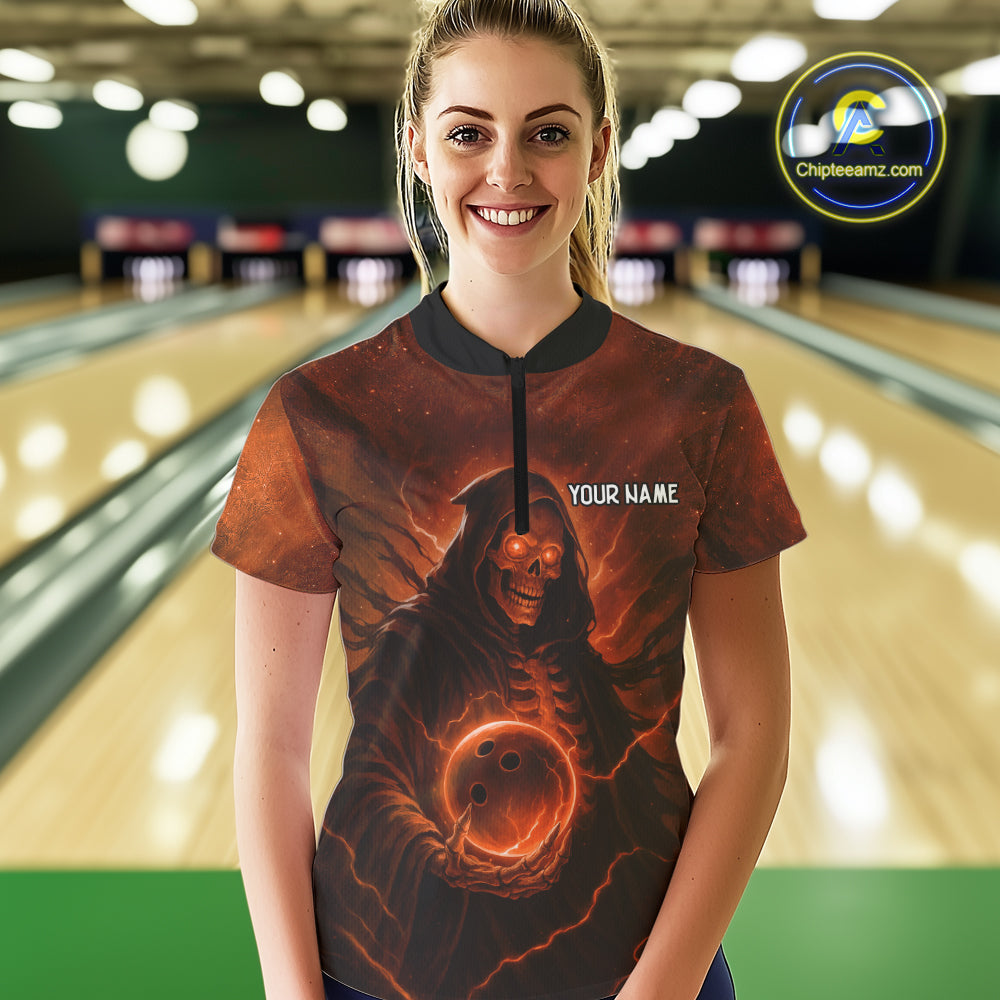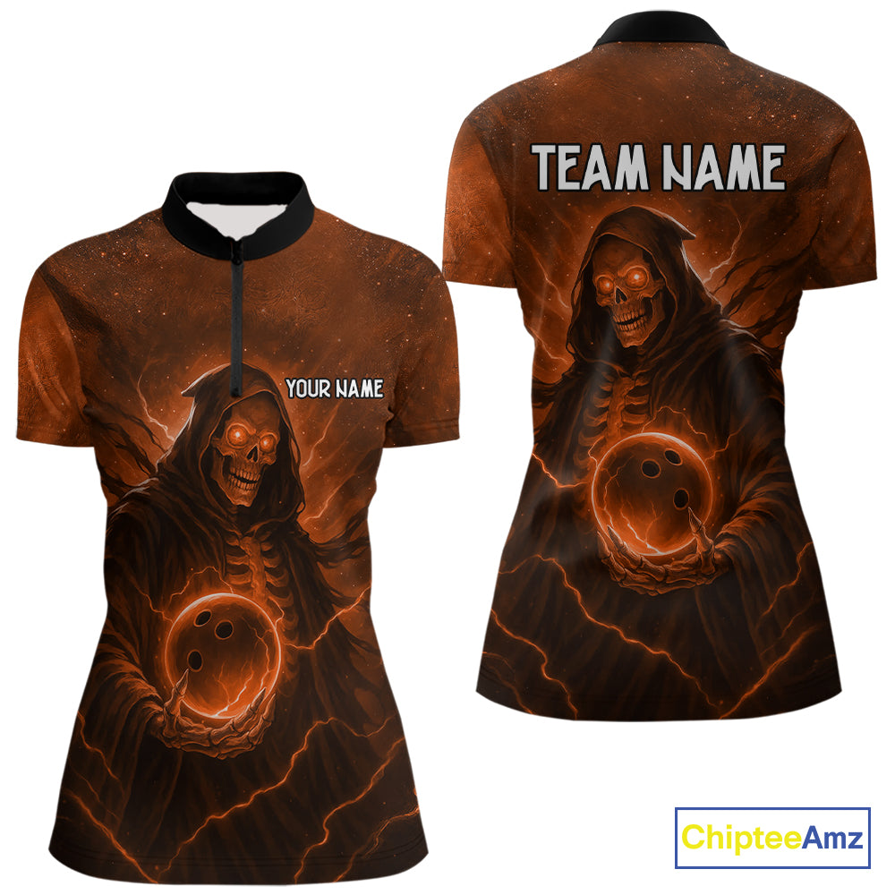 Orange Thunder Lightning Skull Reaper Bowling Shirts For Women Custom Halloween Team Bowling Jerseys NQS10680