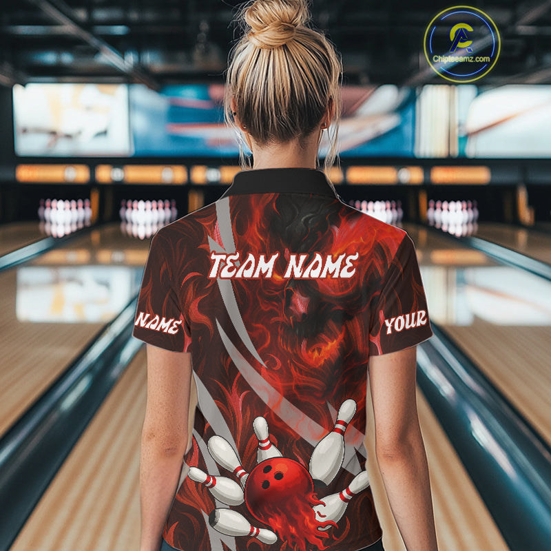 Red Flame Skull Bowling Polo, Quarter Zip shirts For Women Custom Halloween Team Bowling Outfit NQS10636