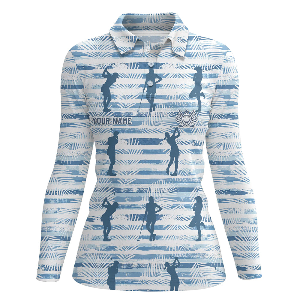 Personalized Blue Stripe Palm Leaves Golf Polo Shirt Tropical Golf Shirts For Women Golf Gift LDT0793