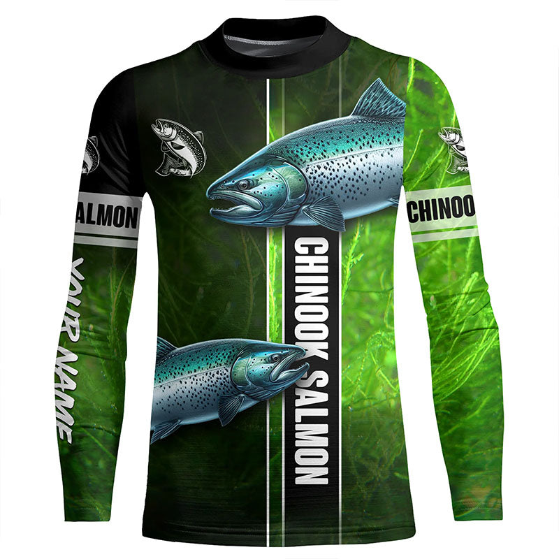 Chinook salmon fishing green camo Custom Long Sleeve Fishing Shirts, fishing gifts for men, women, kid NQS5809