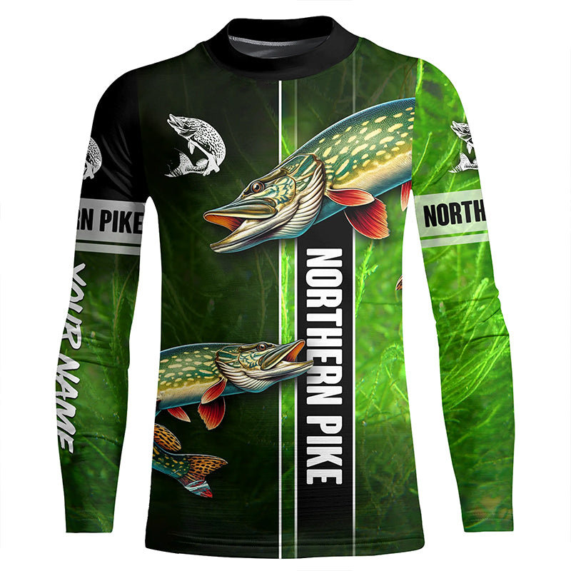 Northern Pike fishing green camo Custom Long Sleeve Fishing Shirts, fishing gifts for men, women, kid NQS5810