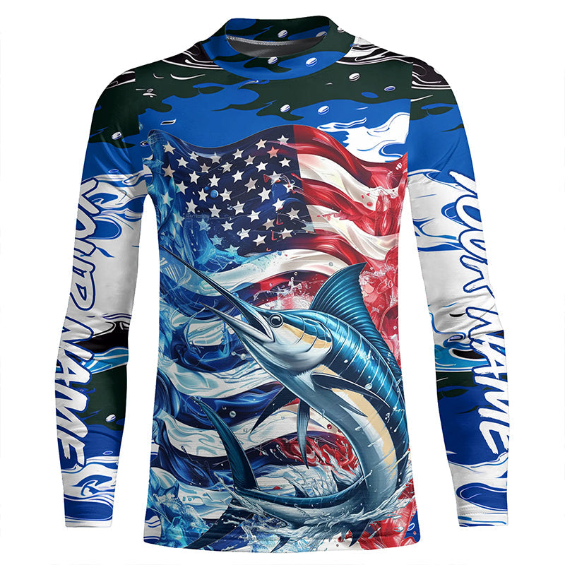 Marlin Fishing Custom Long Sleeve Fishing Shirts, American Flag Patriotic Marlin Fishing Shirt IPHW7024