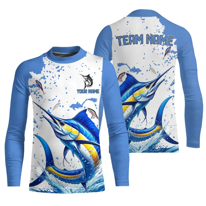 Personalized Blue and white Marlin Fishing Shirts Custom Marlin Long Sleeve Fishing Team Jerseys NQS9308