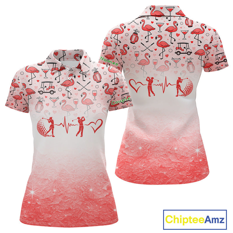 Red Flamingo Heart Theme Matching Golf Polo Shirt For Couple Custom Couple Valentines Outfit NHN0145