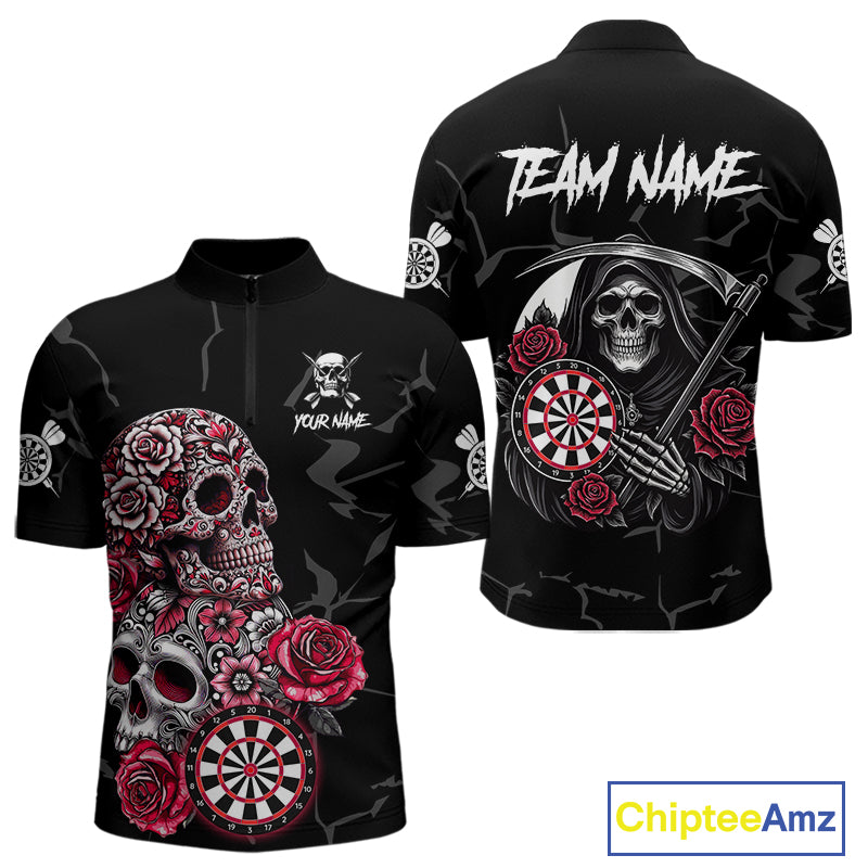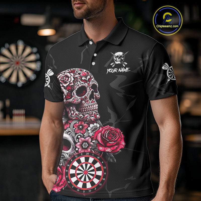 Personalized Red Funny Skull Roses Darts Shirt For Men Custom Darts Team Jersey, Darts Outfit TDM4356