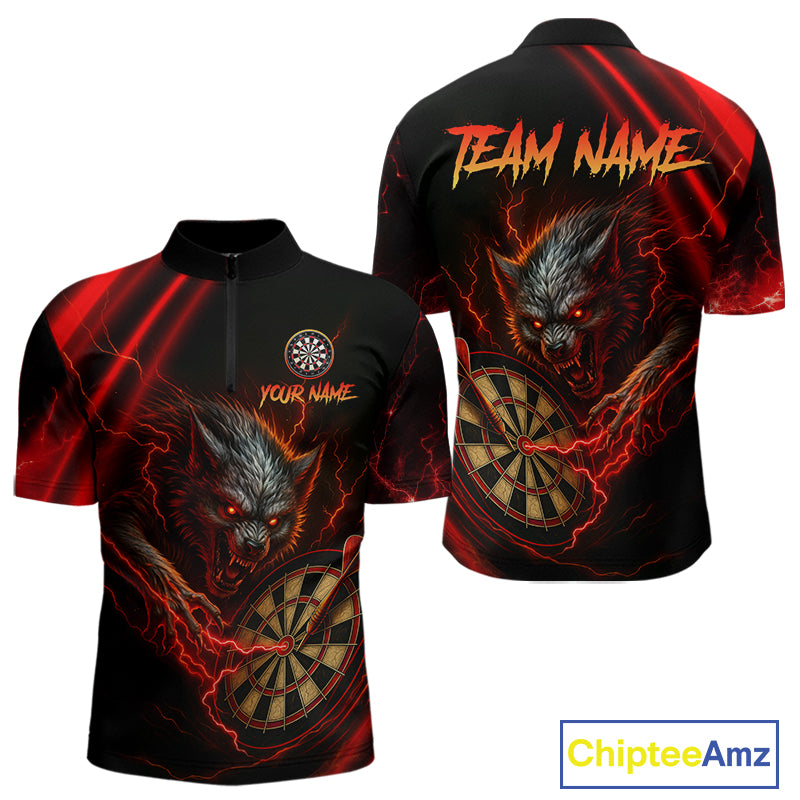 Personalized Red Thunder Lightning Wolf Darts Shirt For Men Custom Dart Team Jersey Polo & 1/4 Zip TDM4383