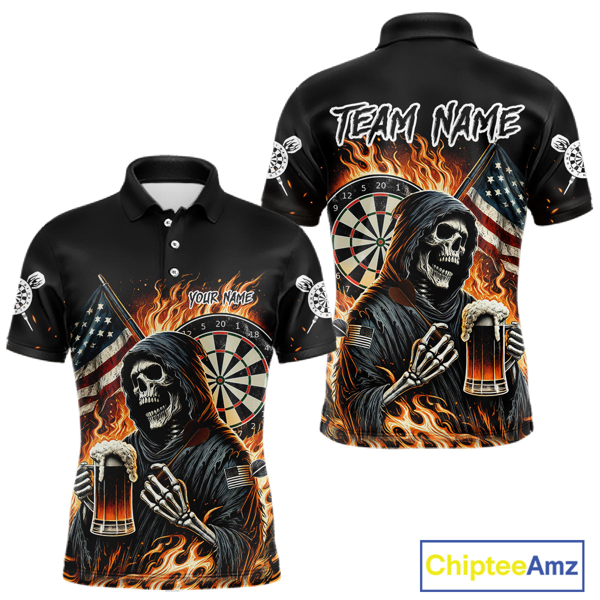 Flaming Grim Reaper Beer Darts Shirt Custom US Flag Darts Polo & Quarter Zip Jerseys For Women TDM4526