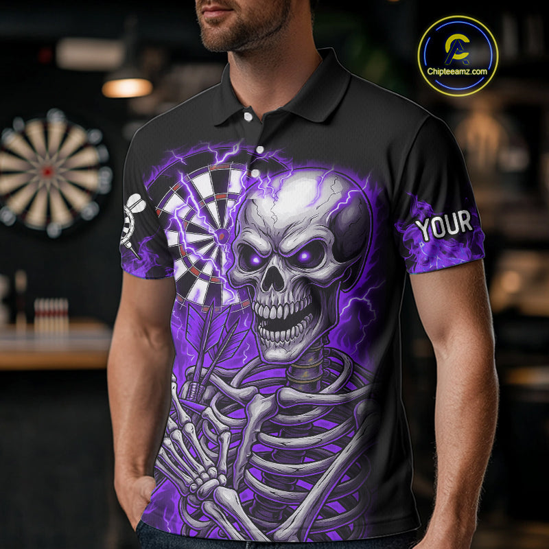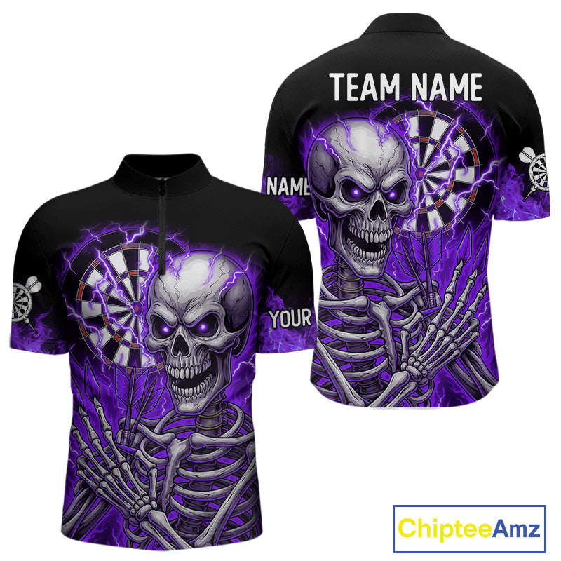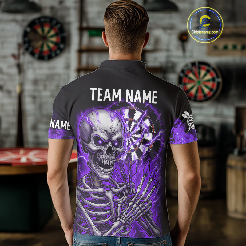 Purple Flaming Lightning Skeleton Darts Shirt For Men Custom Skull Dart Jersey Team Polo & 1/4 Zip TDM4739