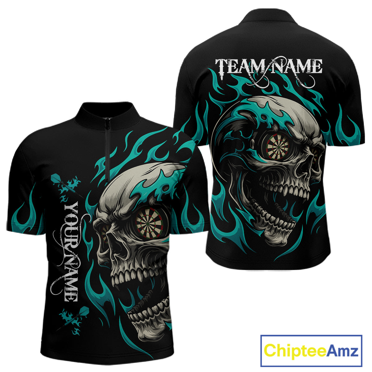 Personalized Turquoise Flaming Skull Darts Shirt For Men Custom Darts Jersey Team Polo & 1/4 Zip TDM4763