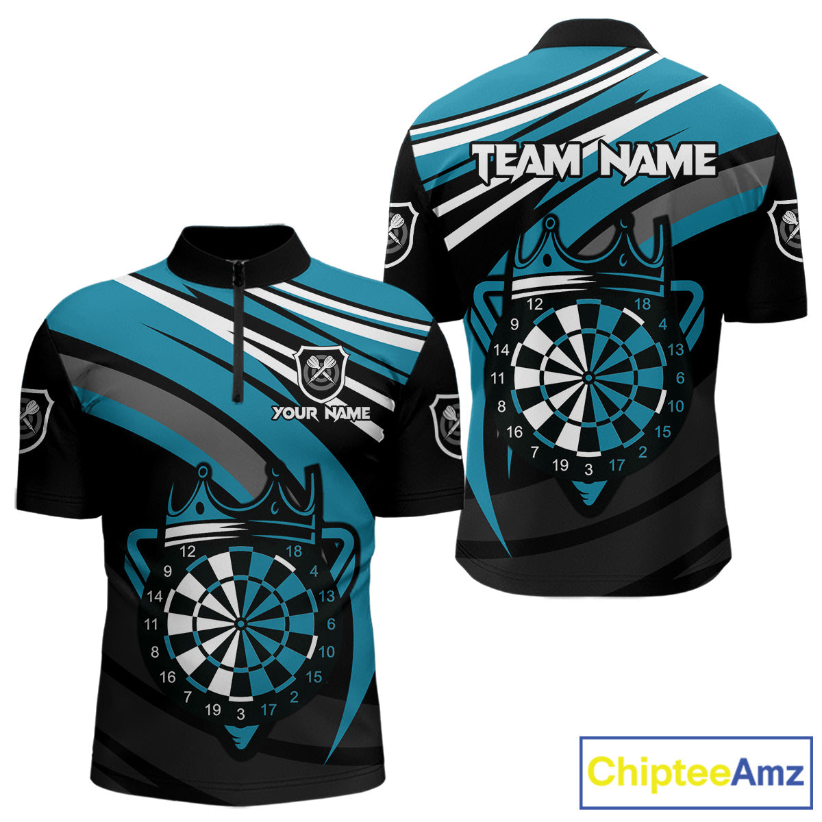 Black & Turquoise Dartboard Crown Darts Shirt For Men Custom Darts Jersey Team Polo & 1/4 Zip TDM4795