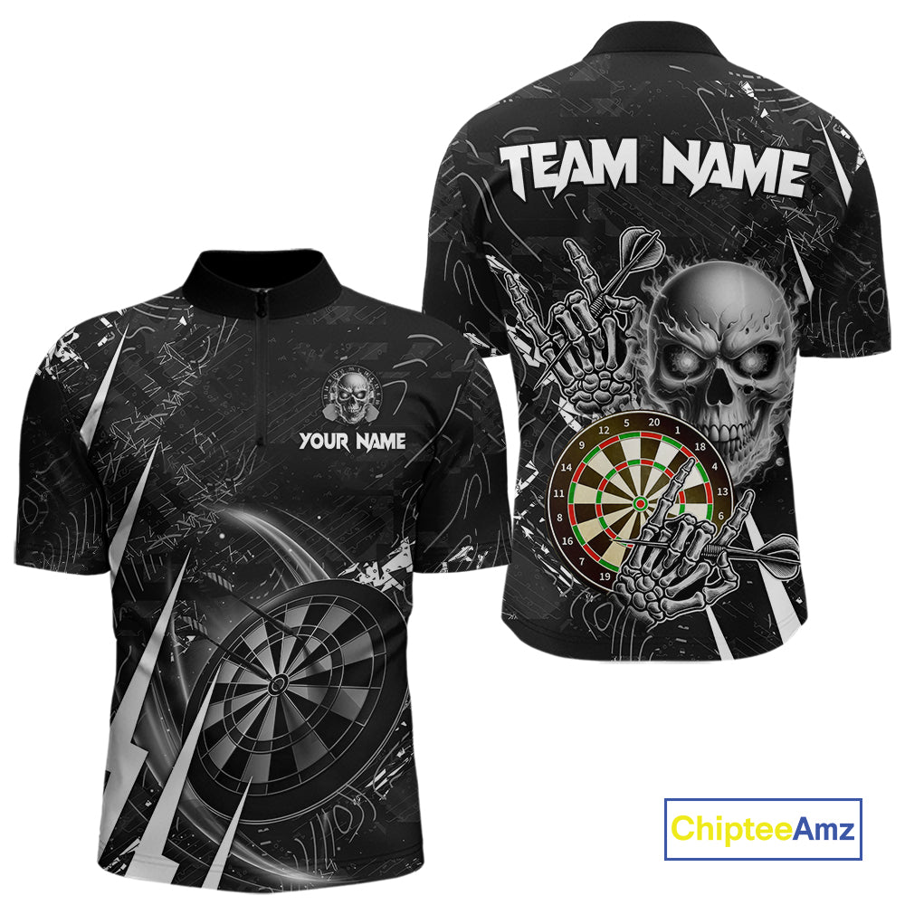 White Black 3D Skull Darts Polo & 1/4 Zip For Men Custom Darts League Team Jersey, Best Darts Gift TDM4828