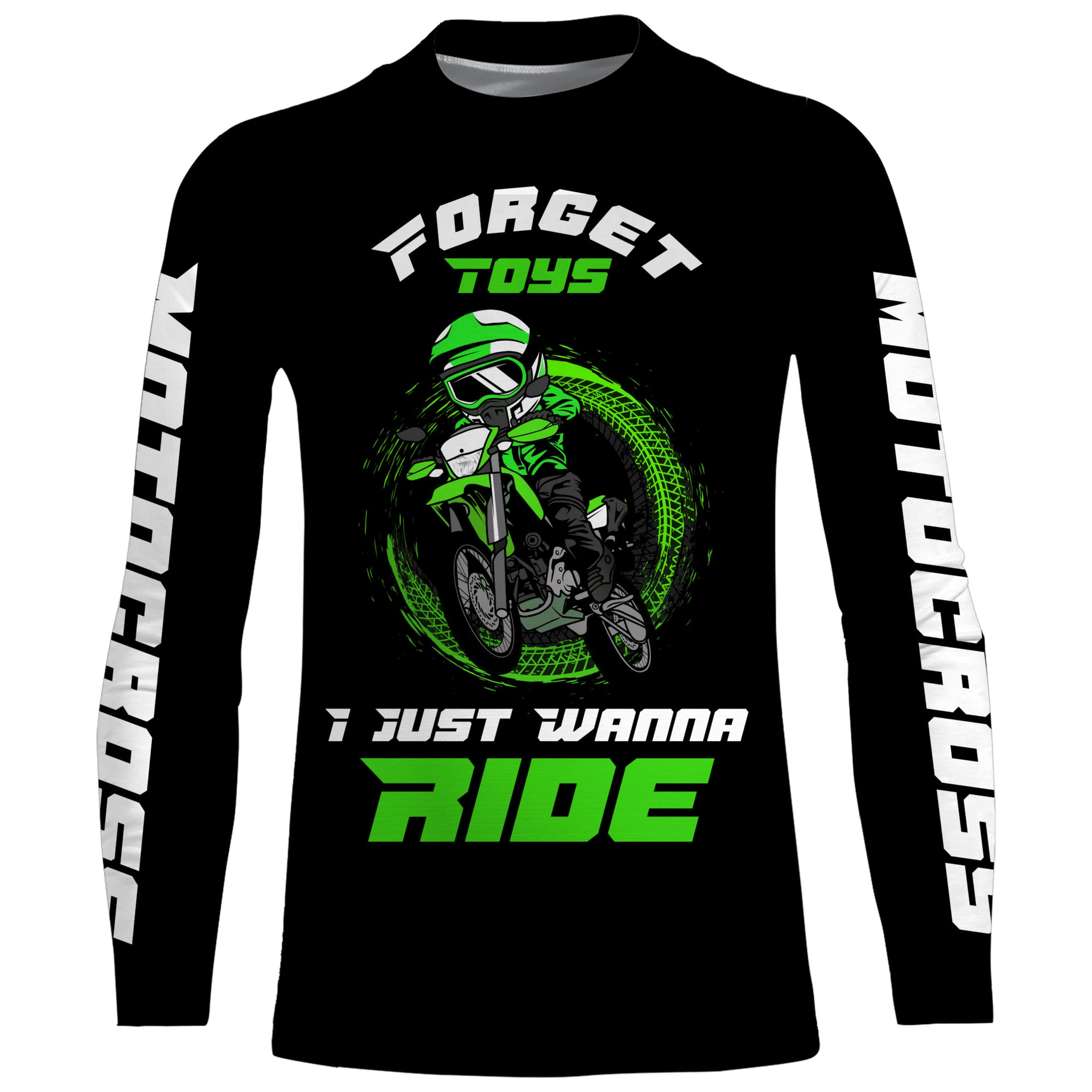 Kid custom motocross jersey UPF30+ youth green dirt bike MX racing Forget Toys I Just Wanna Ride NMS979