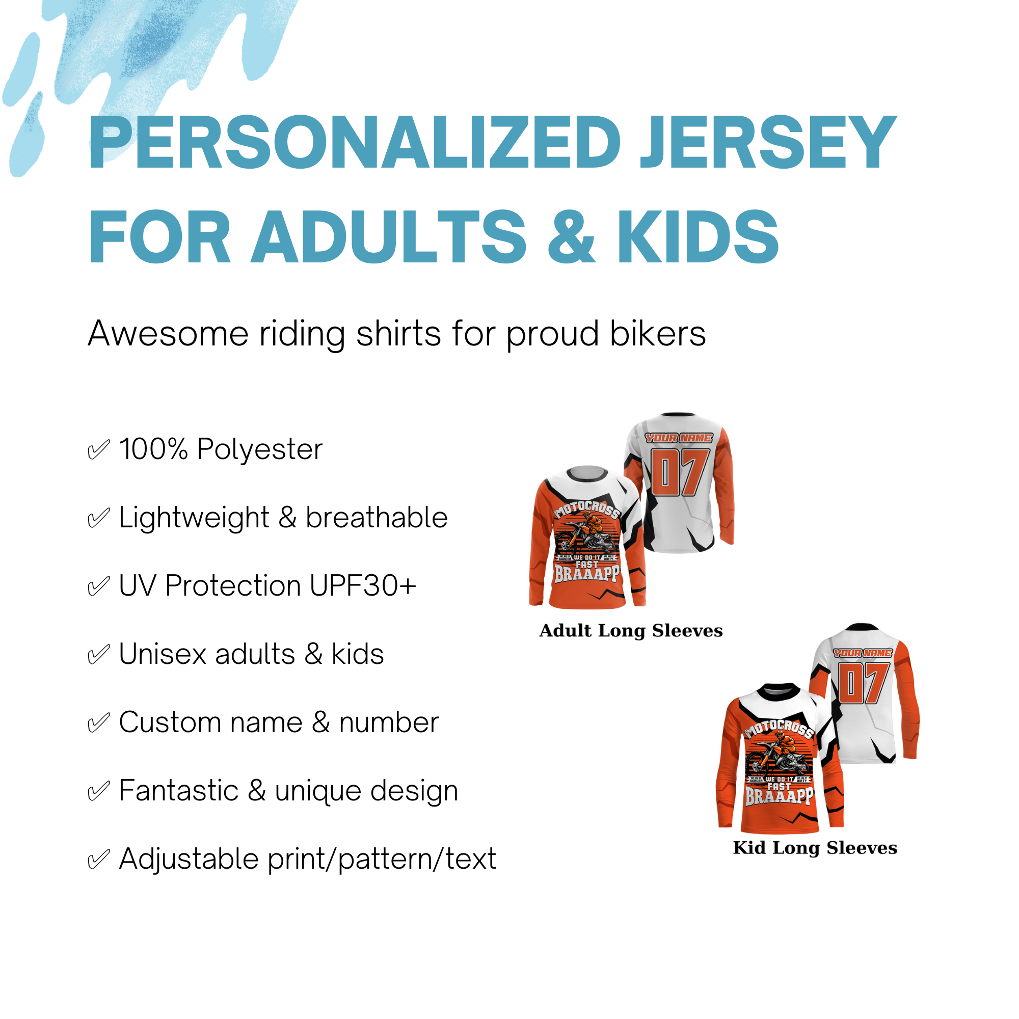- PERSONALIZED RIDING JERSEY: This super cool shirt is exactly what all bikers are looking for. Add your name/number to make it a unique one that bears your own imprints.