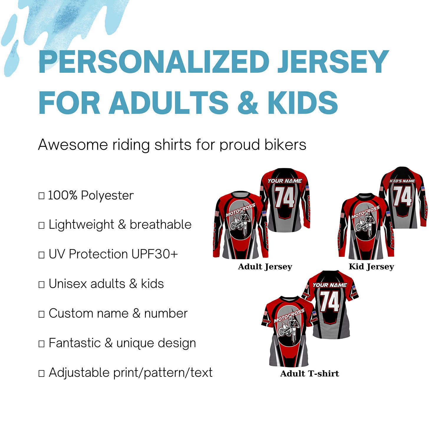 - PERSONALIZED RIDING JERSEY: This super cool shirt is exactly what all bikers are looking for. Add your name/number to make it a unique one that bears your own imprints.