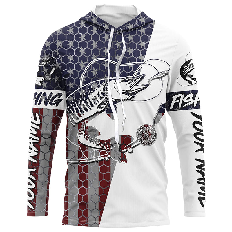 Custom Musky Fishing American Flag Shirts, Patriotic Musky Long Sleeve Fishing Jerseys IPHW6292