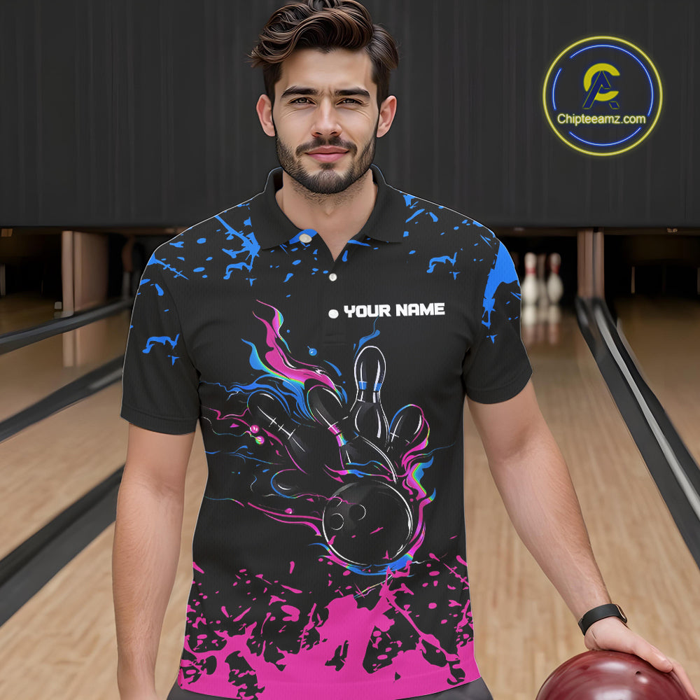 Personalized Black, Blue and Pink Bowling Shirts For Men, Bowling Balls And Pins Bowling Team Shirts NQS10742