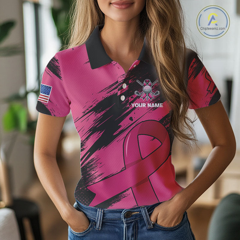 Black and Pink ribbon Women golf polo shirts Custom breast cancer American flag golf top for Women NQS10140