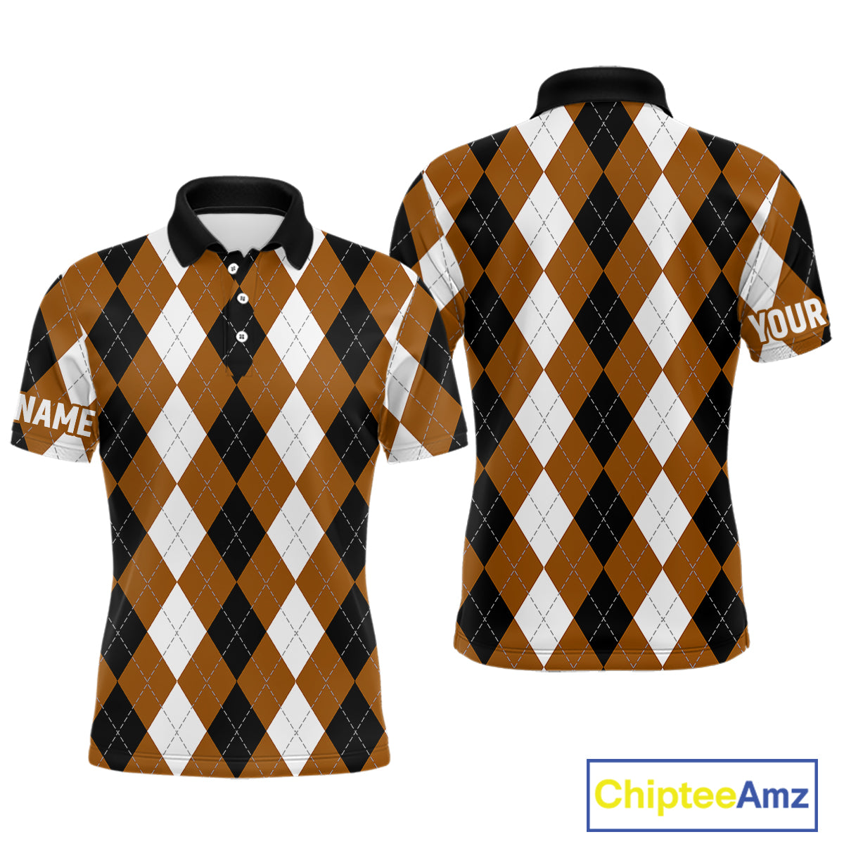 Mens golf polo shirt custom brown argyle plaid pattern golf attire for men NQS9848
