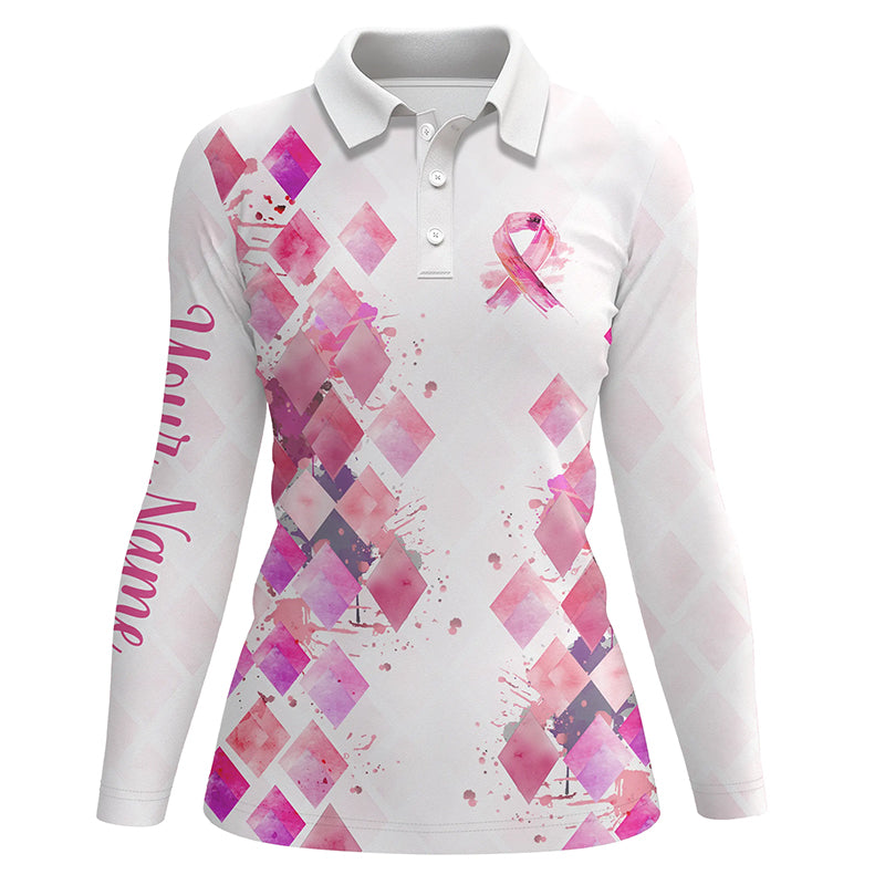 Watercolor Pink ribbon argyle pattern Women golf polo shirts custom breast cancer awareness shirts NQS8285