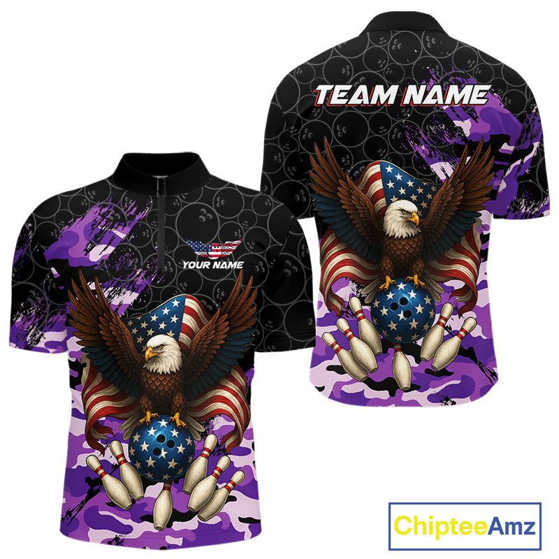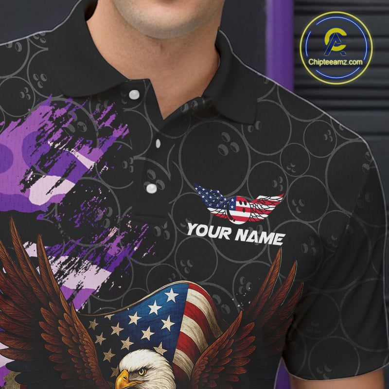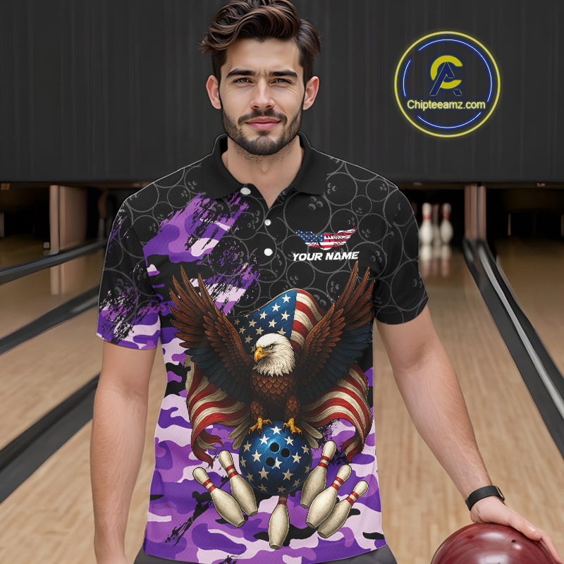 Black and Purple Camo American Flag Eagle Bowling Shirts For Men Custom Patriotic Team Bowling Jersey NQS10645