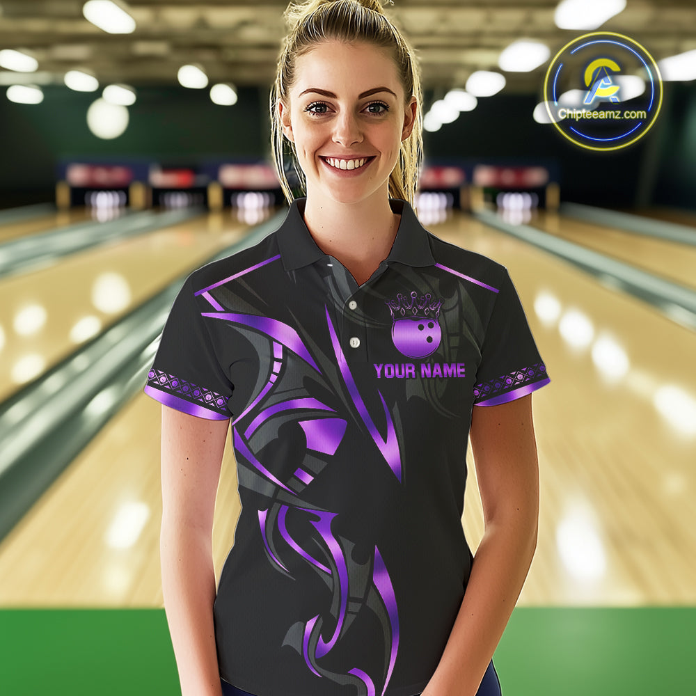 Black and Purple crown Bowling ball Polo, Quarter Zip Shirts for Women Custom Bowling Team jerseys NQS10046