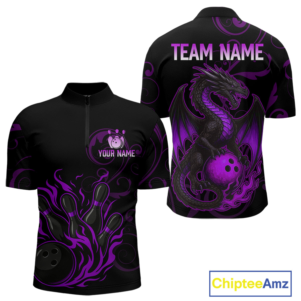 Black And Purple Flame Custom Dragon Bowling Team Shirts For Men, Bowling Uniform Outfit NQS9963