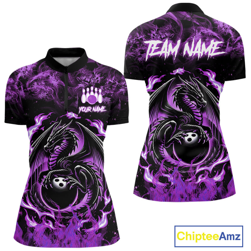 Black and Purple Flame Dragon bowling shirts for Women Custom Bowling Team Jersey, gift for Bowler NQS10247