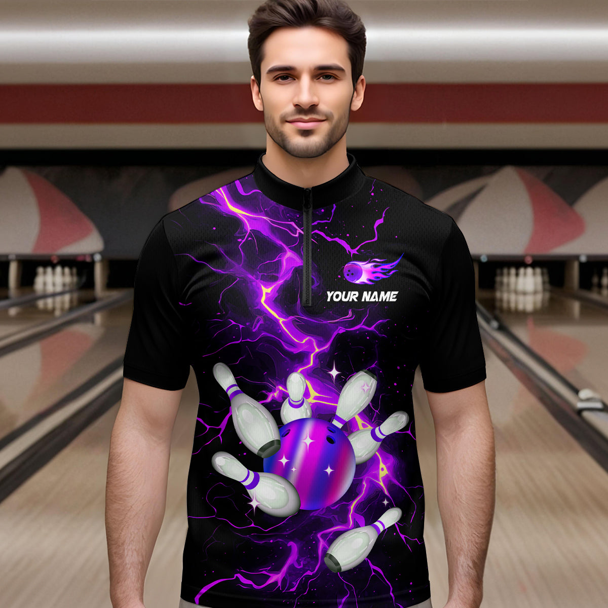 Black and Purple Lightning Bowling Shirts For Men Custom Bowling Team Uniform Bowlers Outfits NQS9597
