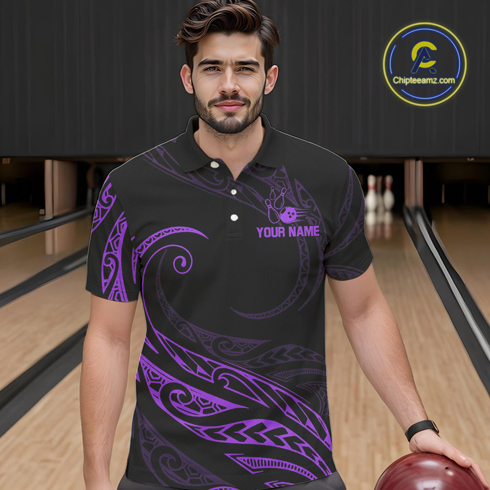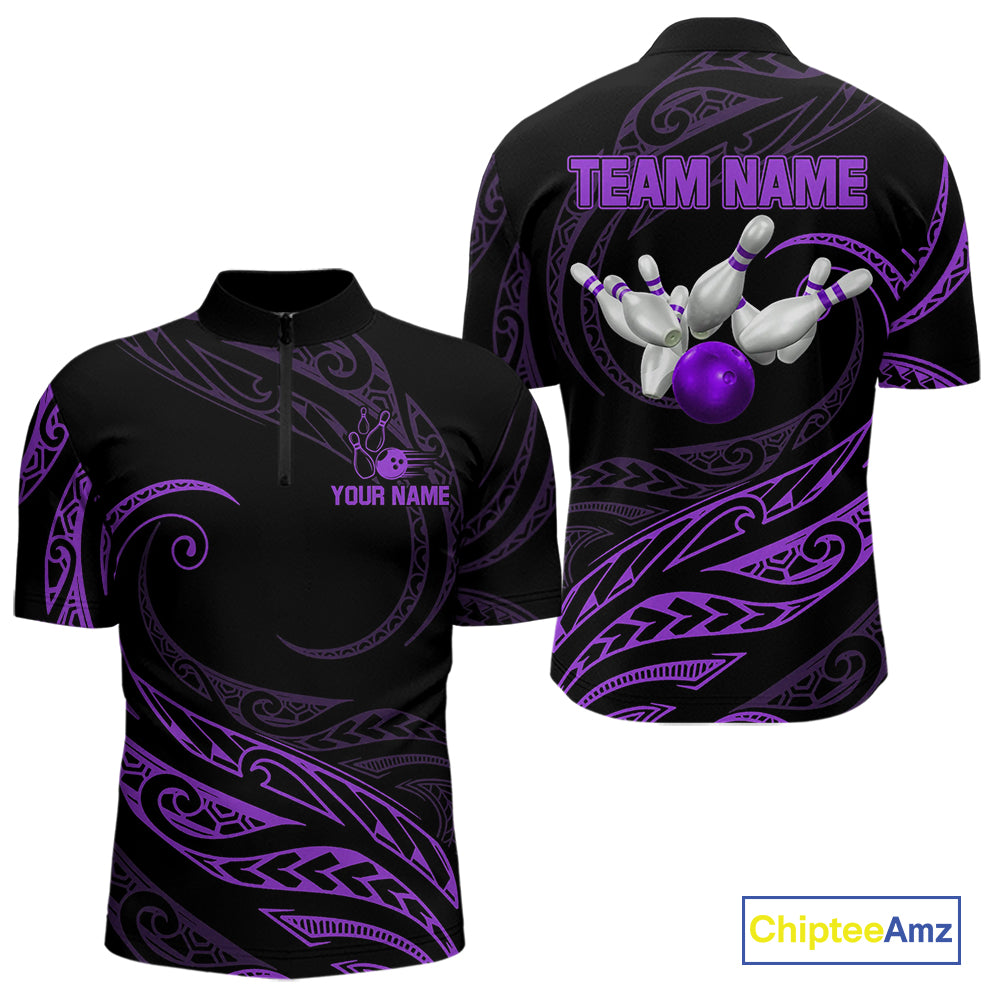 Black and Purple Tribal Pattern Bowling Polo, Quarter Zip shirts For Men Custom Team Bowling Jerseys NQS10486
