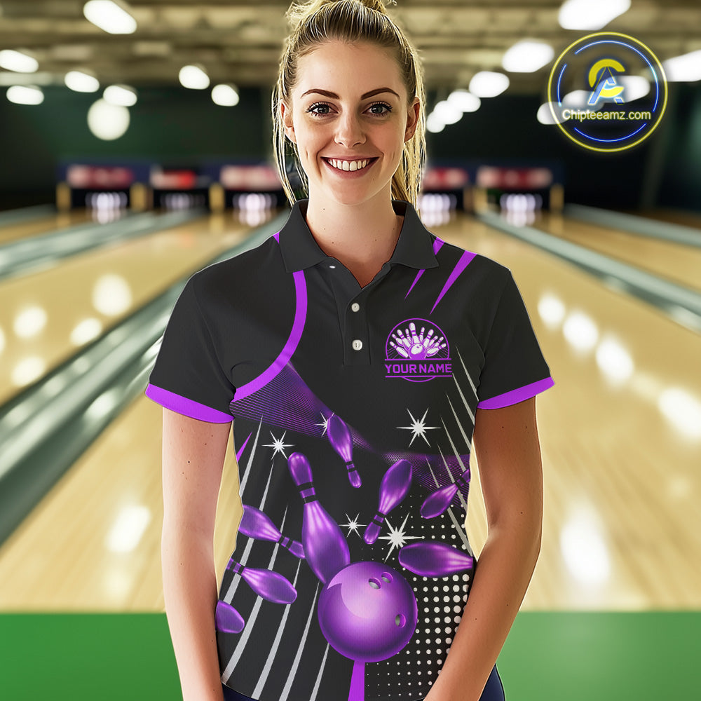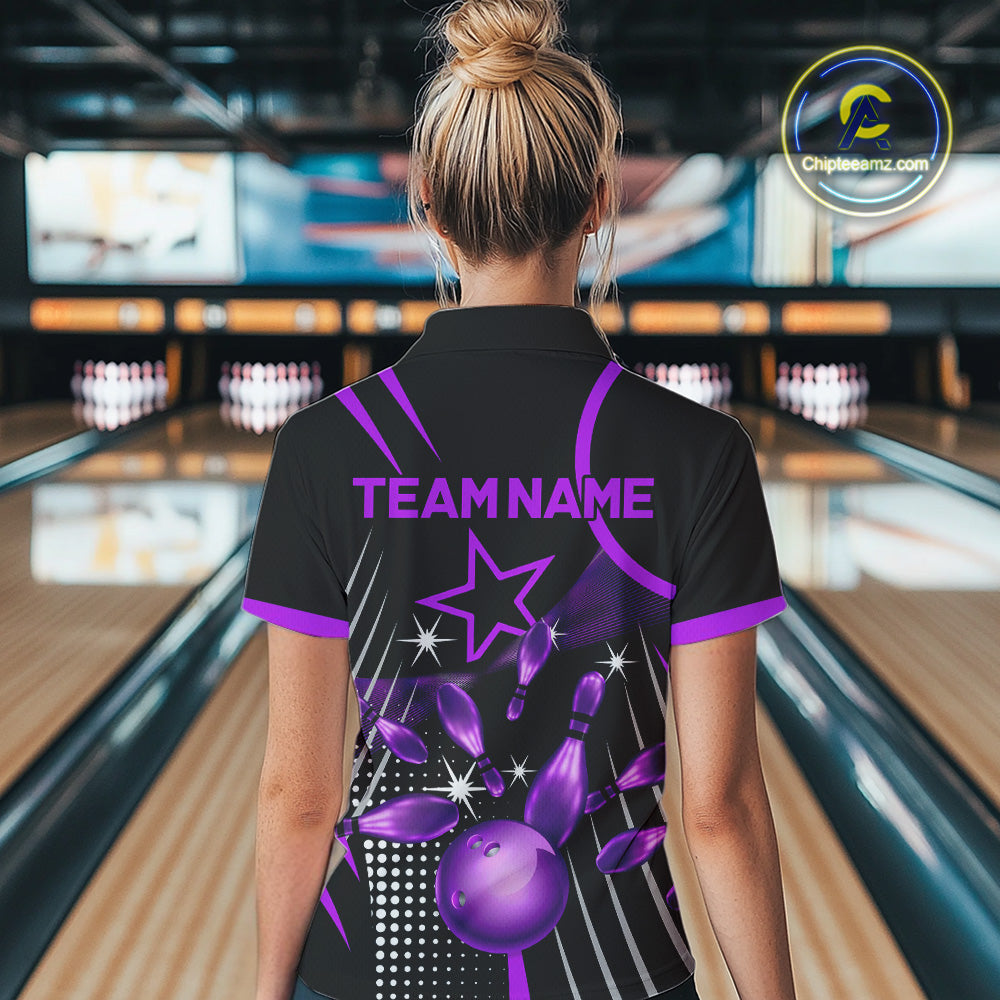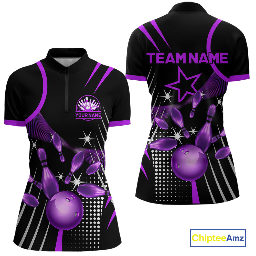 Black and Purple Women Bowling Polo, Quarter Zip Shirts Custom Bowling outfit ladies Team Jerseys NQS9958