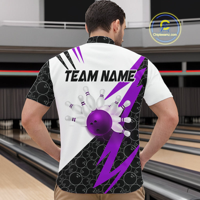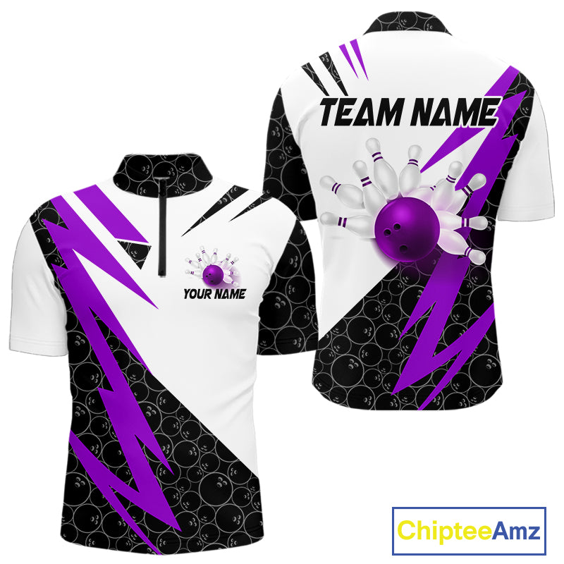 Black and White Bowling Polo, Quarter Zip Shirt for Men Custom Lightning Team bowling jersey | Purple NQS10003
