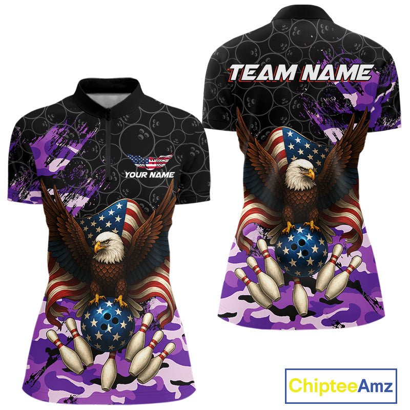 Black & Purple Camo American Flag Eagle Bowling Shirt For Women Custom Patriotic Team Bowling Jersey NQS10645