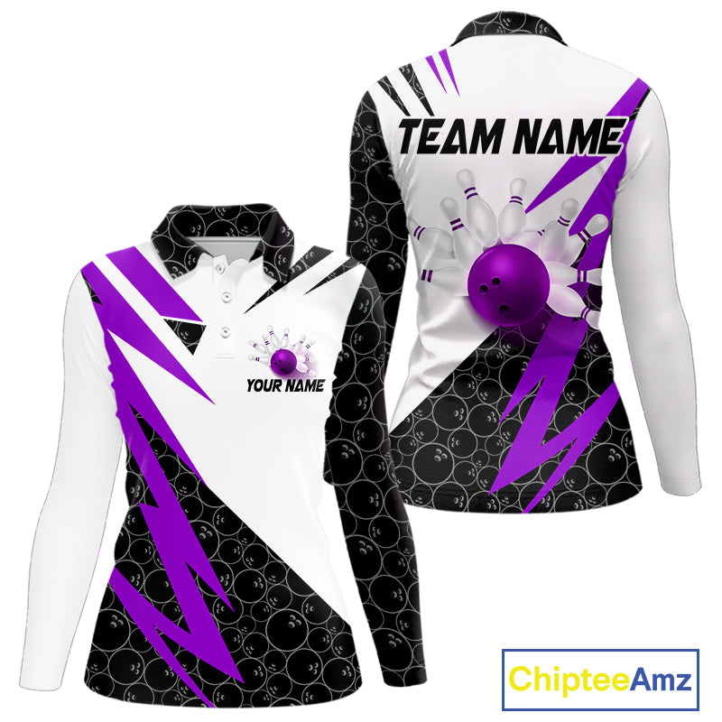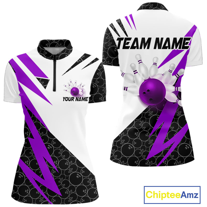 Black & White Bowling Polo, Quarter Zip Shirt for Women Custom Lightning Team bowling jersey | Purple NQS10003
