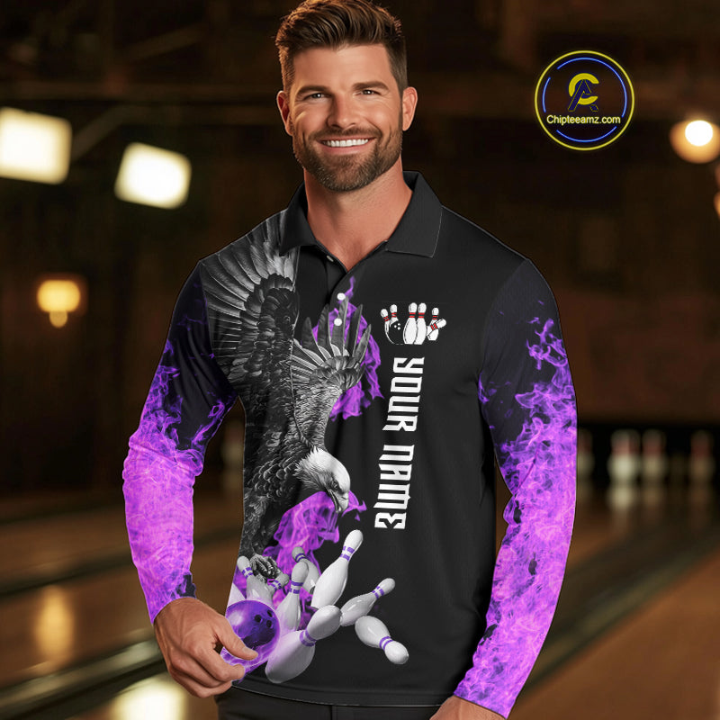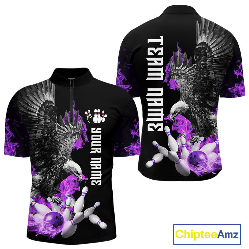 Custom Purple Flame Black Eagle Bowling Polo, Quarter Zip Shirt For Men, Team Bowling Clothes NQS10351